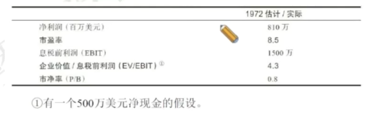 -总估值:6875万美元。巴菲特花了6000万美元买下90%股权。购买价格对应的市盈率为11.9倍,企业价值/息税前利润倍数为6.3倍。另外,巴菲特给了B夫人一个条款:B夫人可用500万美元的对价回购10%的股份,而且,之后他们真的这样做了。所以,巴菲特最终是以5500万美元,购买了这家企业80%的股权。估值: PE=8.5倍,PB=0.8倍。